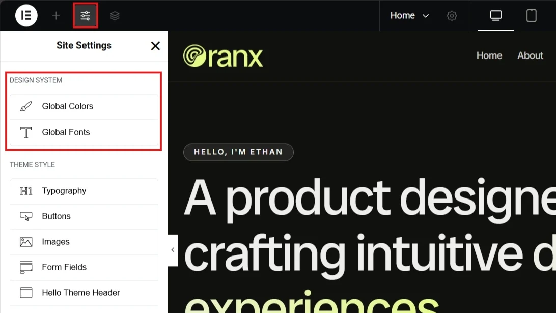 • Choose what you want to customize, the Global Colors or Global Fonts